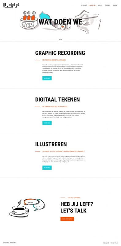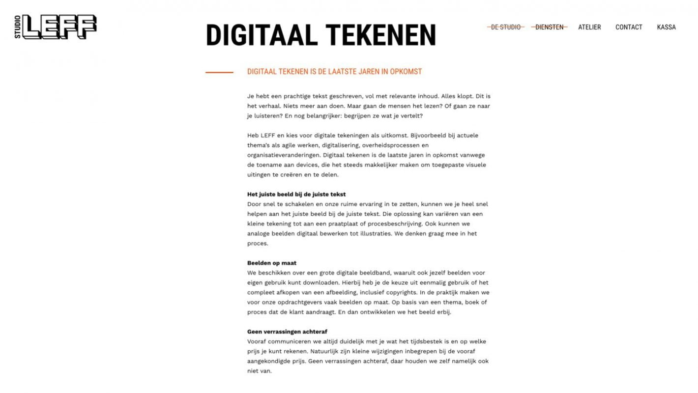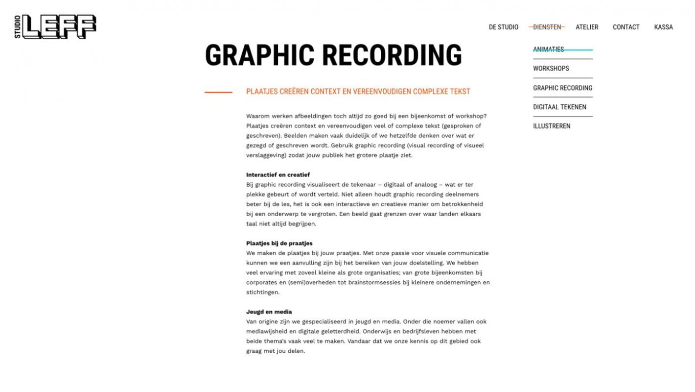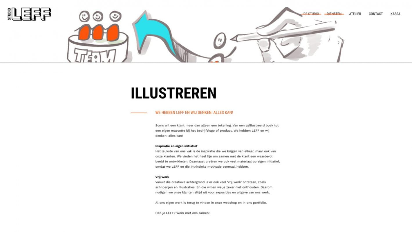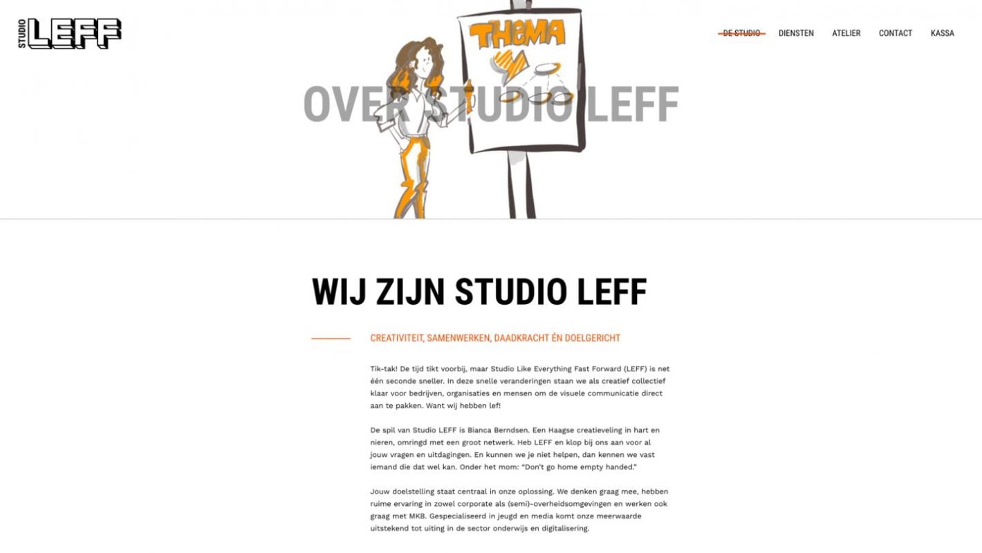 Studio LEFF is een creatief collectief voor visuele communicatie in het hartje van Den Haag. Bianca Berndsen, de spil van deze creatieve club, was haastig op zoek naar iemand die de webteksten voor haar kersverse website kon herschrijven. Volgens haar miste er iets: pit én lef.